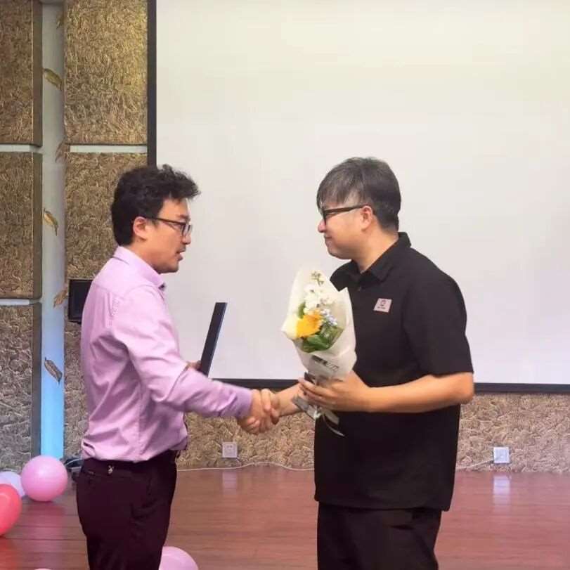 孙校长走上台,代表学校向新加入的教师们致以最诚挚的节日祝福。他将一束束精心准备的鲜花递到每一位新教师手中,这不仅是一份问候,更是一份沉甸甸的期许与嘱托。愿你们在未来的岁月里,以花为媒,播撒希望;以梦为马,不负韶华,在这片教育的沃土上,书写属于自己的光辉篇章。