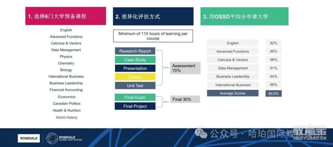学习OSSD课程的学生不需要本地学籍、户籍,免高考、免A-Level等标准化考试,利用12年级**高6门课的平均*便可申请海外知名大学。