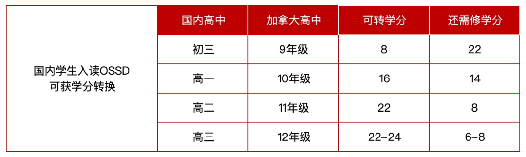 OSSD课程可以灵活利用各种课程体系的学生置换学分,如果学生为高三的学生,可以提供初三至高二的*单置换OSSD学校22个学分,最后一年修满8个学分,达到毕业要求即可获得OSSD毕业证书。