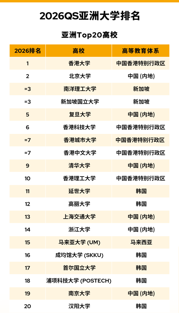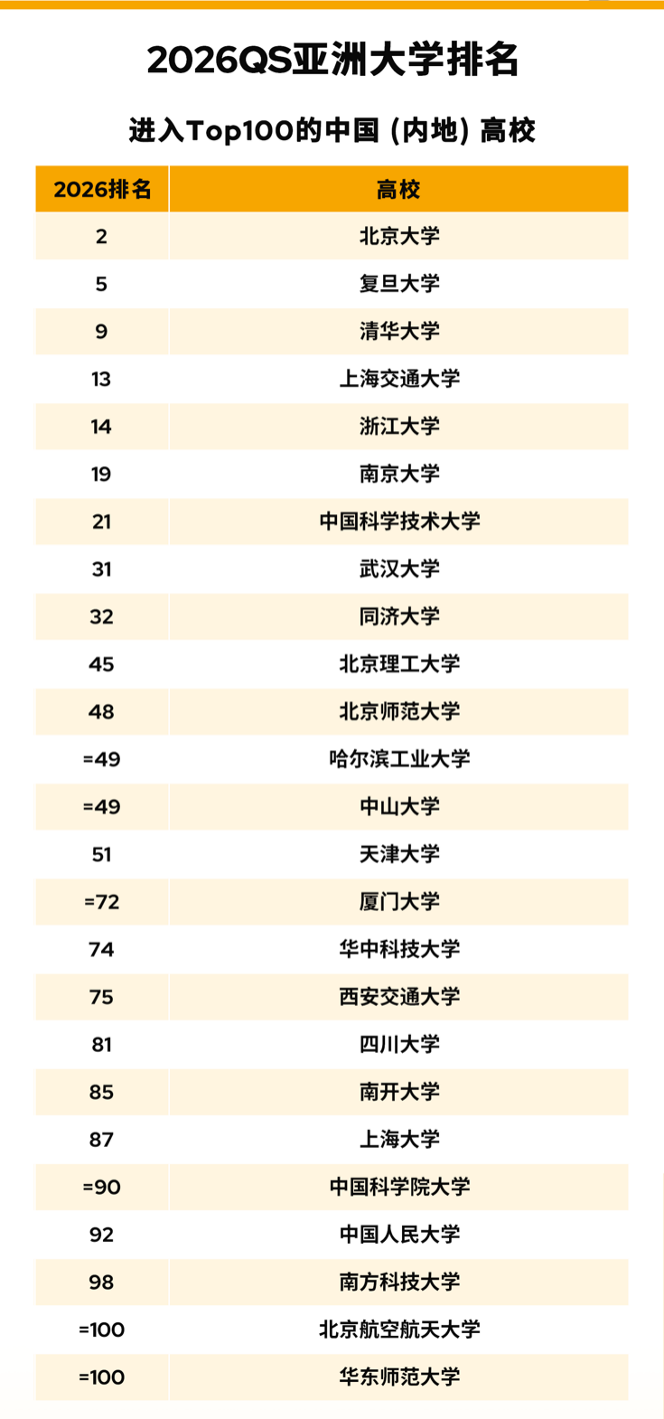国际高等教育研究机构QS于11月4日(昨天)正式发布了2026QS亚洲大学排名。
