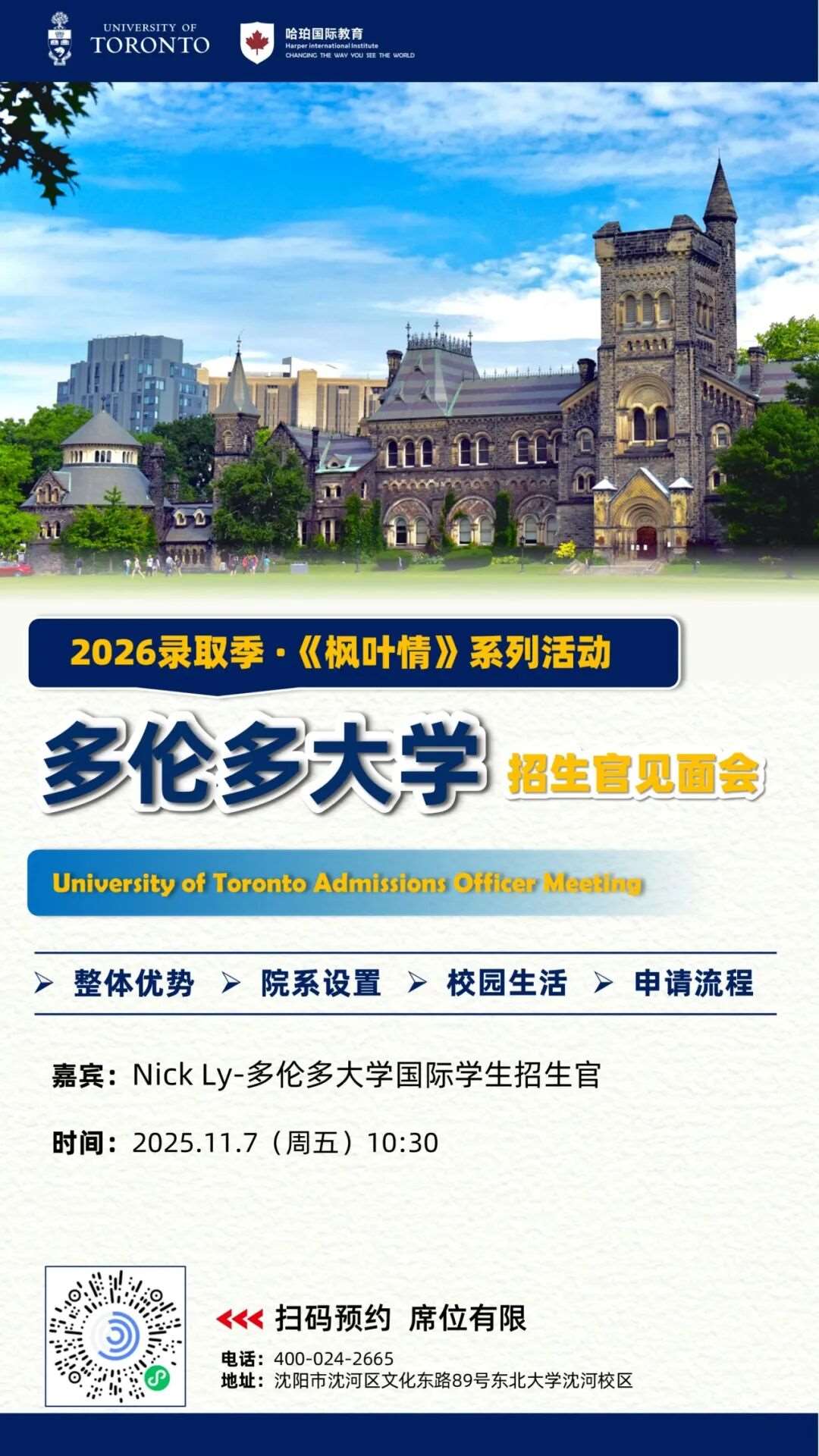 想直面加拿大多伦多大学招生官,获取一手申请攻略吗?11 月 7 日,哈珀国际教育重磅邀请多大招生官 Nick Ly 老师亲临现场,与学生及家长面对面深度交流!