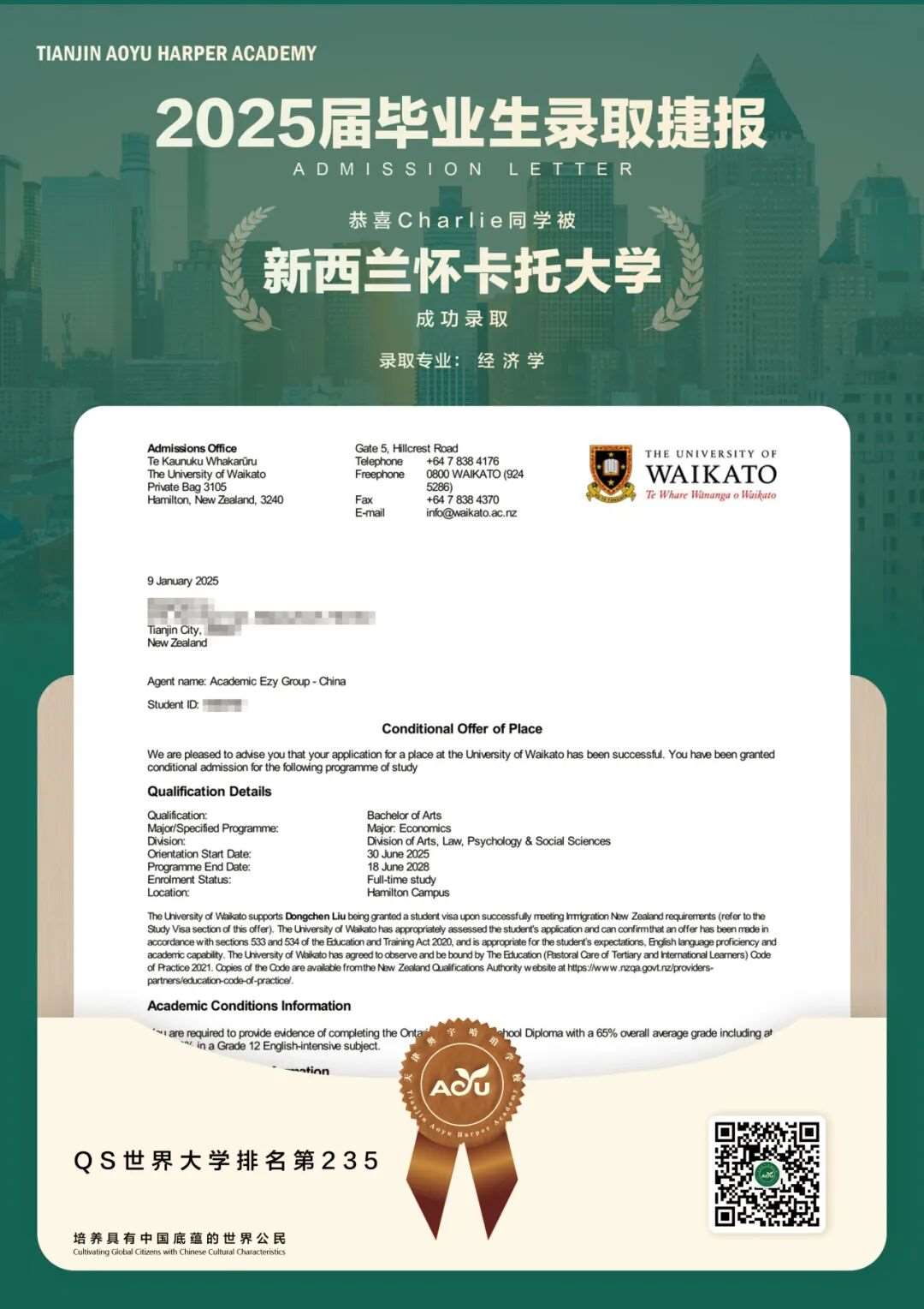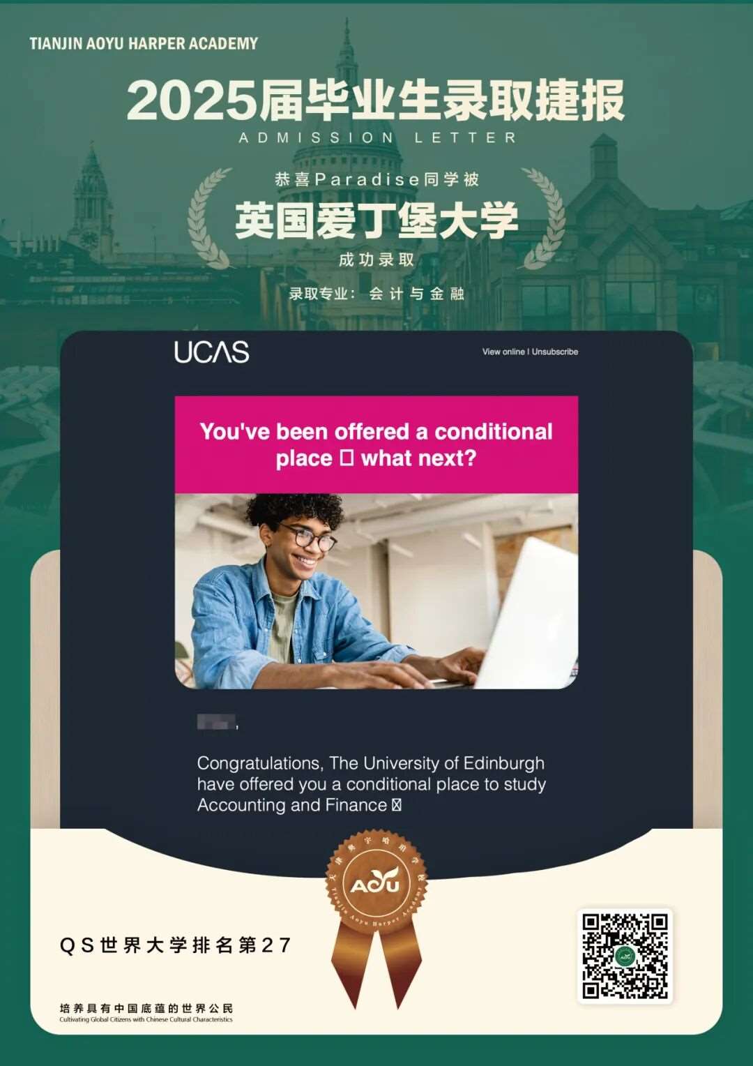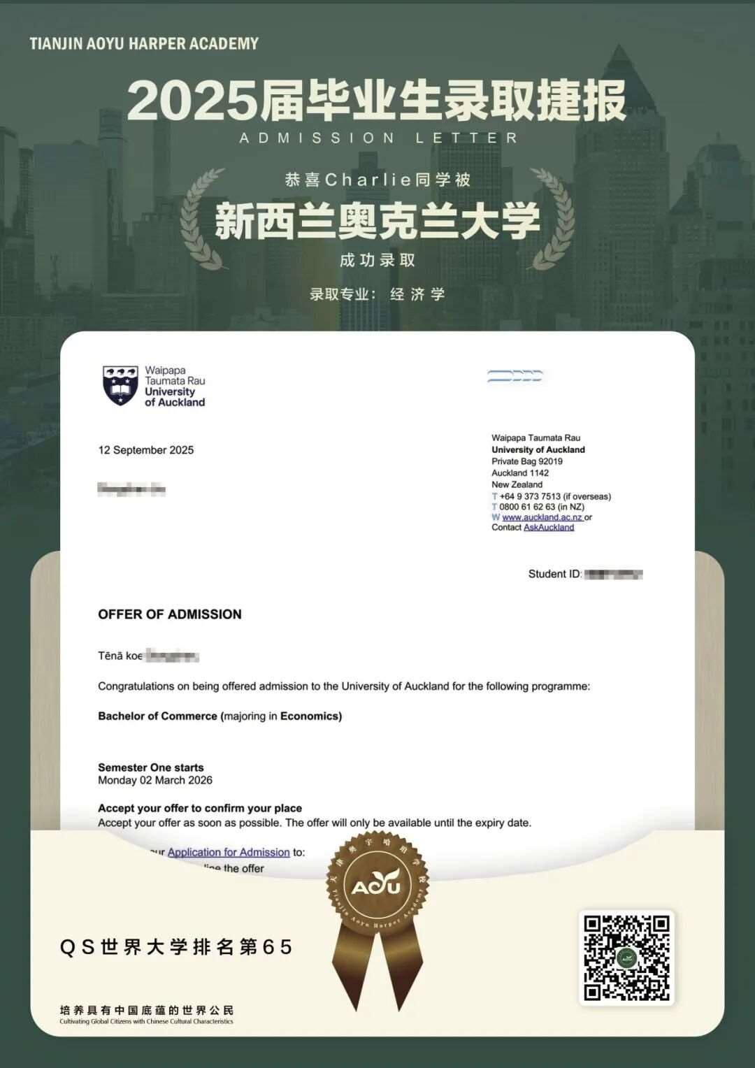 努力、清醒的回报是一张梦想的offer,一切如Charlie所愿,他非常高兴。在国际高中的这一年他学到了不一样的知识,收获了很多朋友,学会了独立自主,实现了当初的理想。