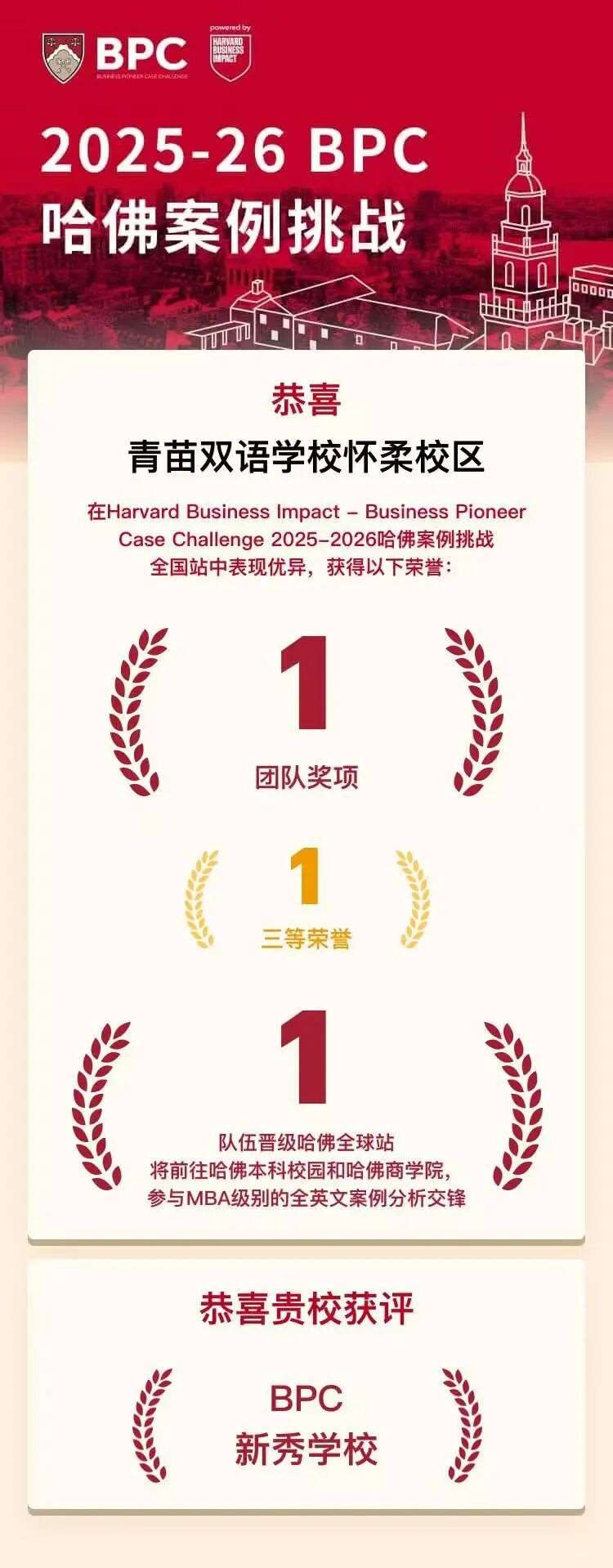 近日,在备受瞩目的BPC哈佛商业领袖峰会全国站中,青苗中加学部参赛团队凭借出色的商业洞察、团队协作与创新能力,从全国近百支队伍中脱颖而出,斩获全国前30%的优异*,并成功推荐参加全球总决赛的宝贵资格!这不仅是对我校学子商业素养的高度认可,更是对我校国际教育成果的有力彰显。