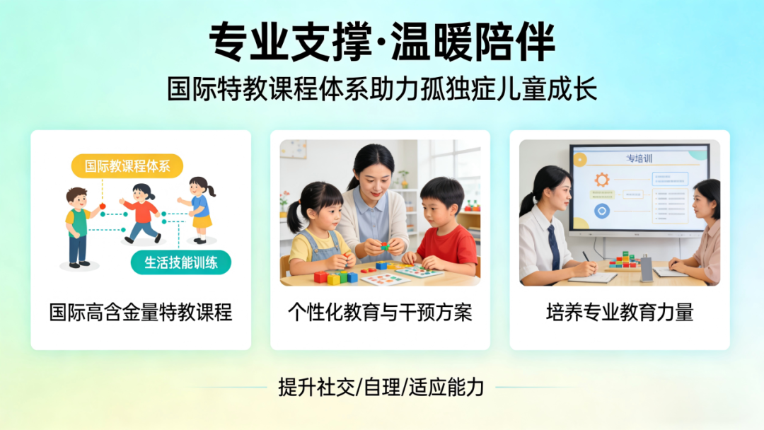 除了暖心陪伴,学校更注重专业支撑。我们将引入国际高含金量特教专业课程体系,凭借严谨的国际教育理念,为孤独症孩子定制个性化教育与干预方案,用科学方法帮助他们提升社交、自理与适应能力,同时培养更多具备专业素养的教育力量。