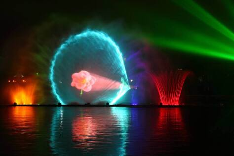 光与水表演,结合高功率激光、探照灯、聚光灯和火焰效果喷泉,营造出梦幻般的视觉盛宴。